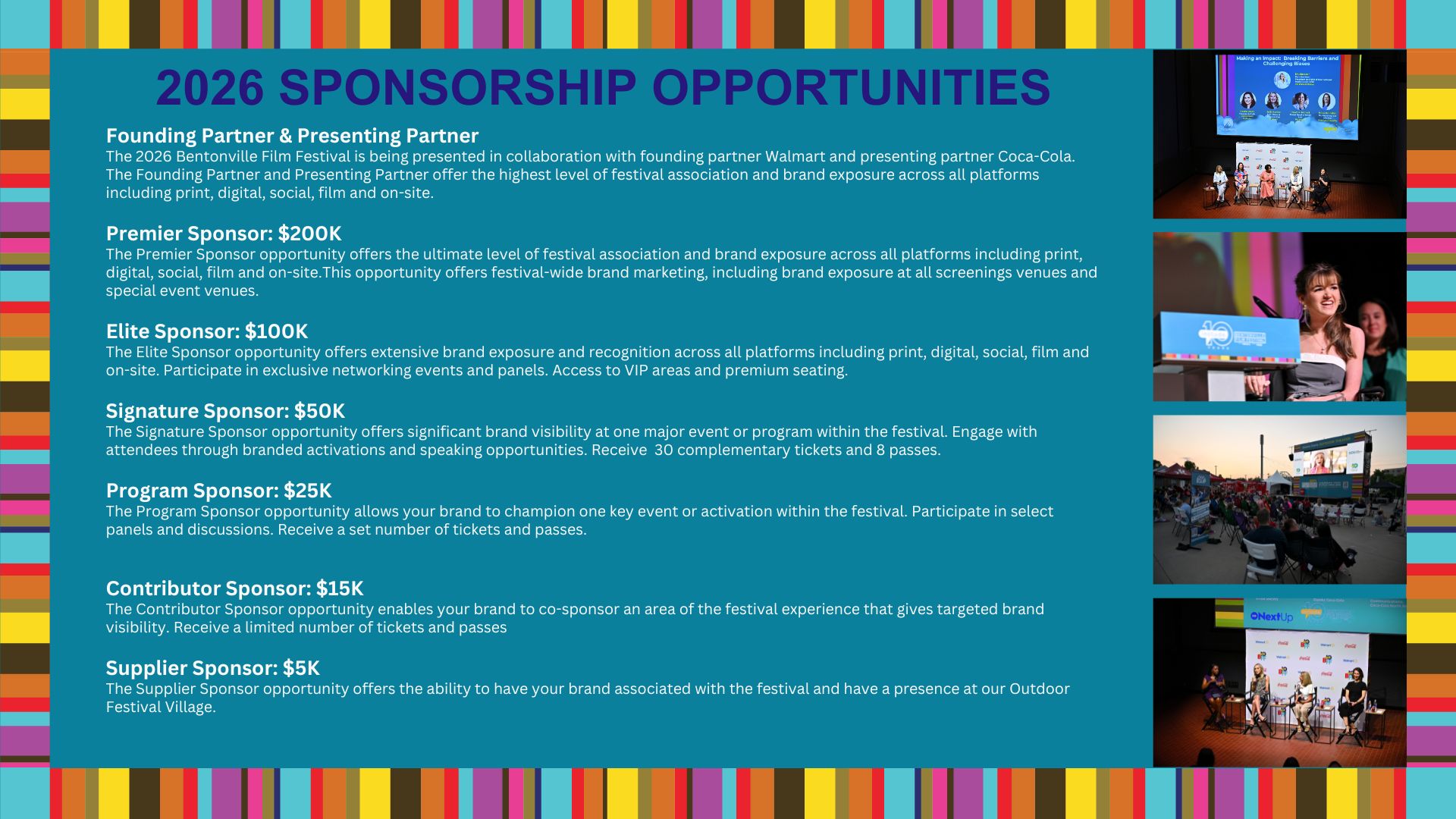 Bentonville Film Festival sponsorship is a powerful marketing tool. We pride ourselves on not only on our top-tier programming, but on our enterprise value as an established and respected brand within the arts and entertainment industry. For more information, please contact Meagan Zavala, meagan@bentonvillefilm.org.